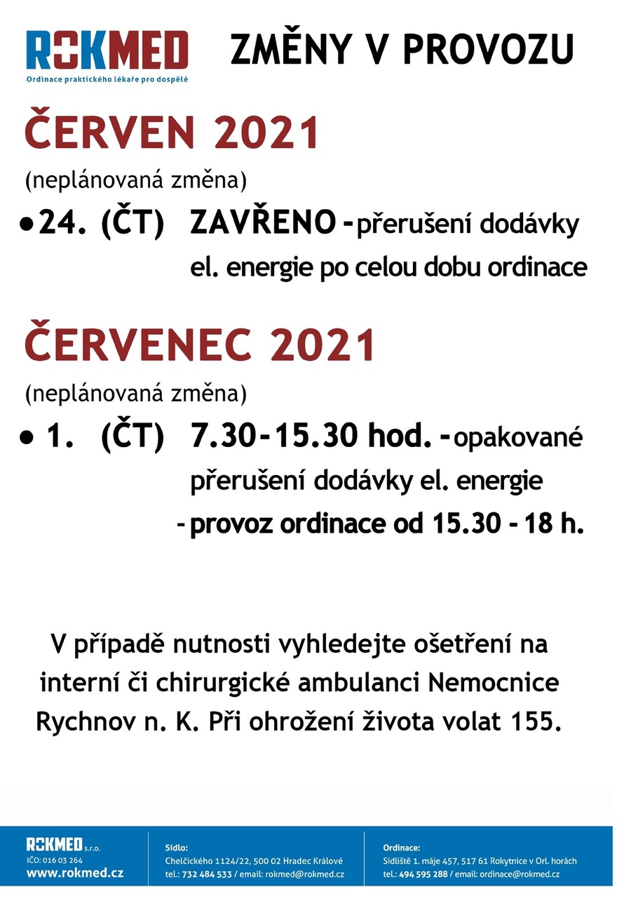 ZMĚNY V PROVOZU ORDINACE PRAK. LÉKAŘE - červen, červenec 2021